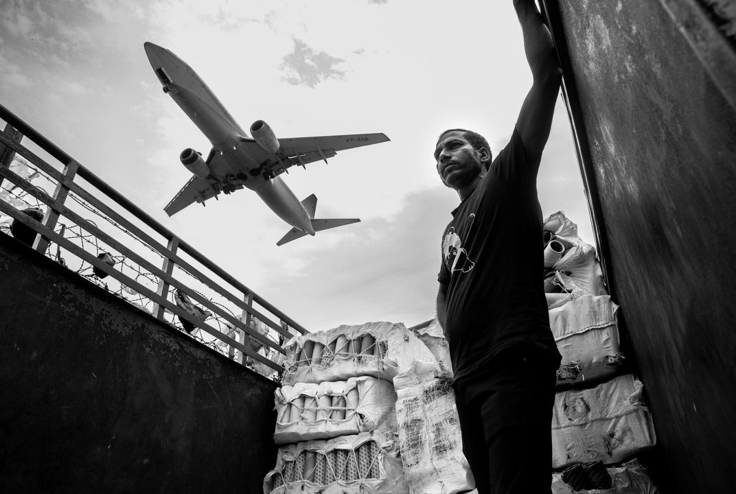 Framed by steel and shadow, a guy pauses between his work beneath the roar of a descending plane caught between motion and stillness in the heart of an industrial maze in mumbai
