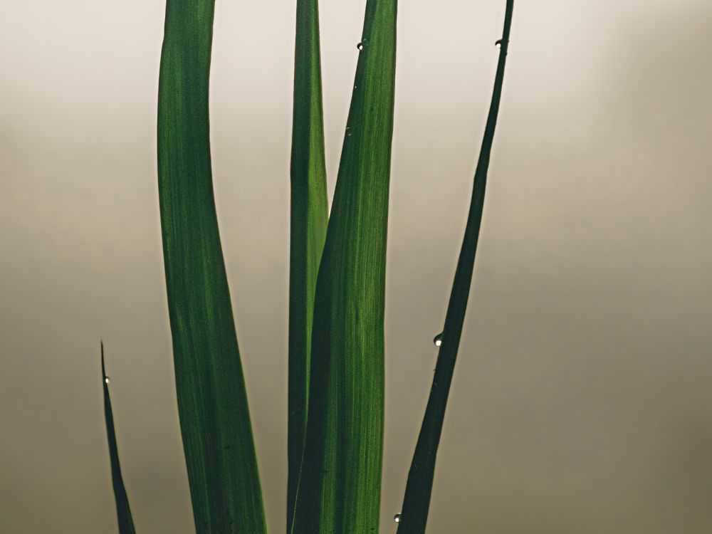 A photograph capturing a rare moment of dewdrops on green branches in the early morning during sunrise.