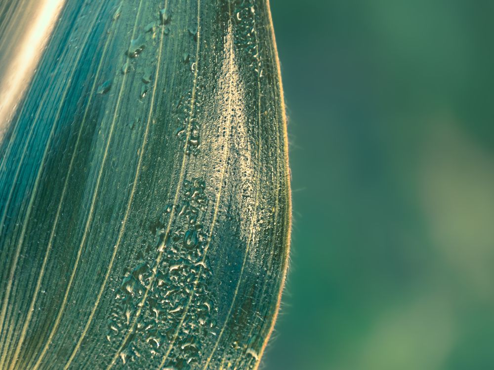 A photograph documenting a rare moment of dewdrops on a green branch leaf in the early morning at sunrise.