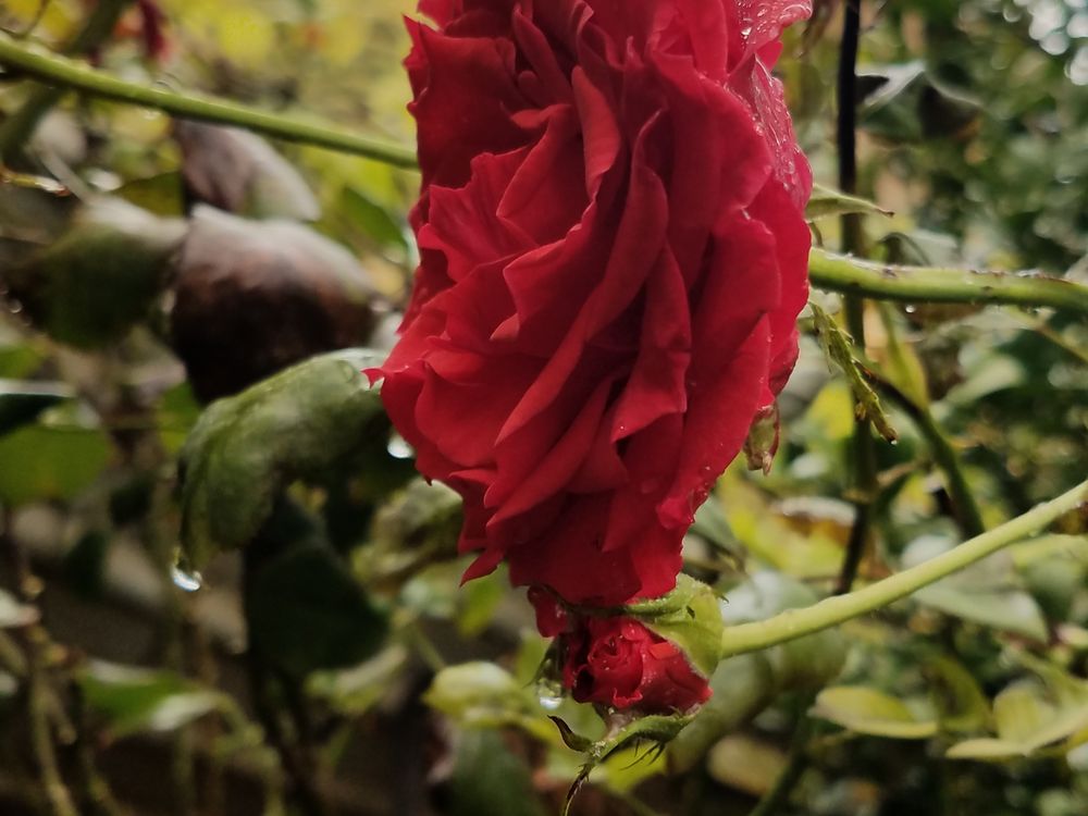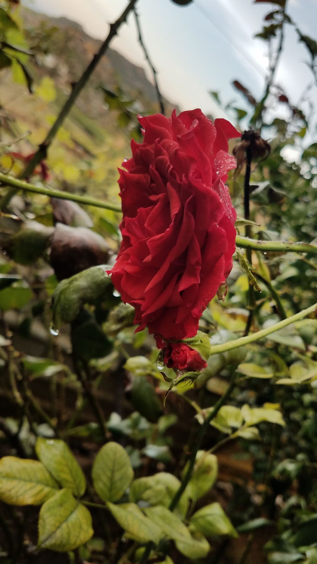 The image shows elegant roses at one of April's sunsets after a rainy afternoon.It was a bracing weather and roses would look at their best at the end of a rainy day.