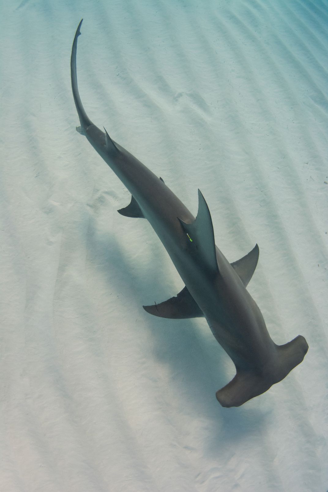 The great hammerheads (Sphyrna mokarran) of Bimini are likely the most photographed within the hammerhead family. In this image you’ll notice a scientific tag on the base of this hammerheads dorsal; this tag was placed by scientists of the Bimini Biological Field Station Foundation and I was grateful to witness its placement through a freediving tagging technique.