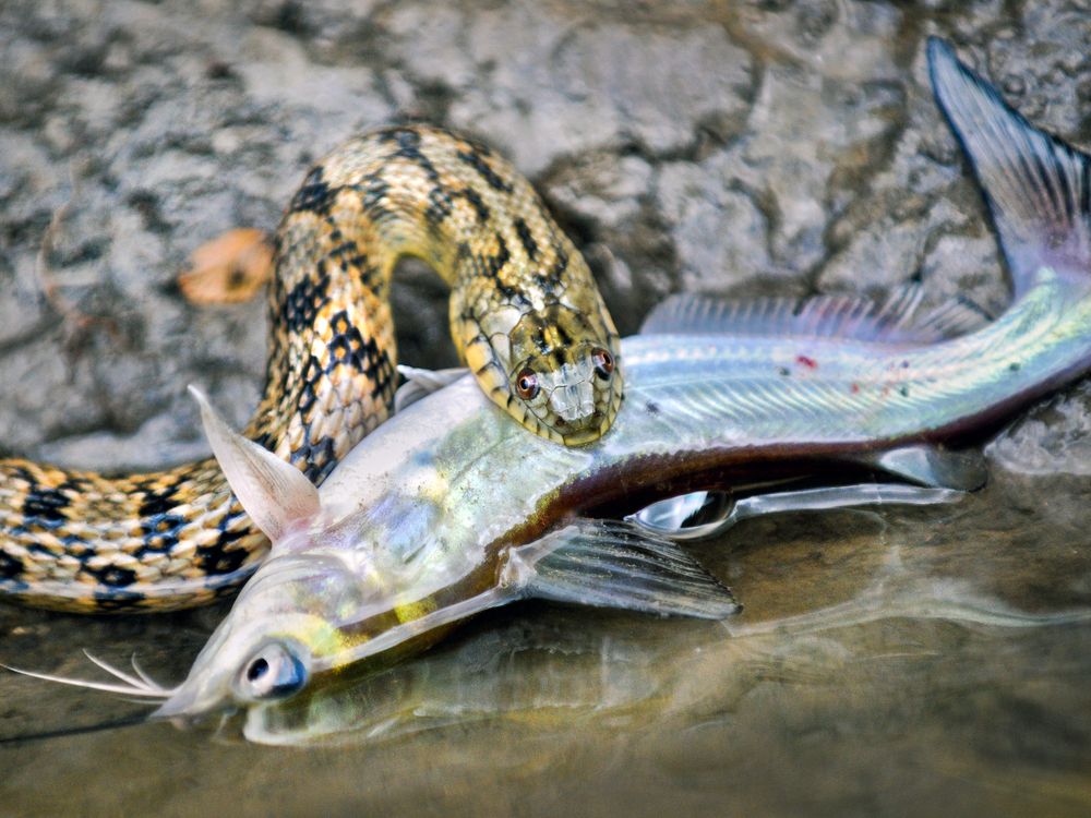 A juvenile Diamondback Water Snake battles for its meal against a small fish. This snake has no venom so this is truly a battle of the fittest.