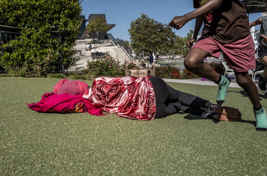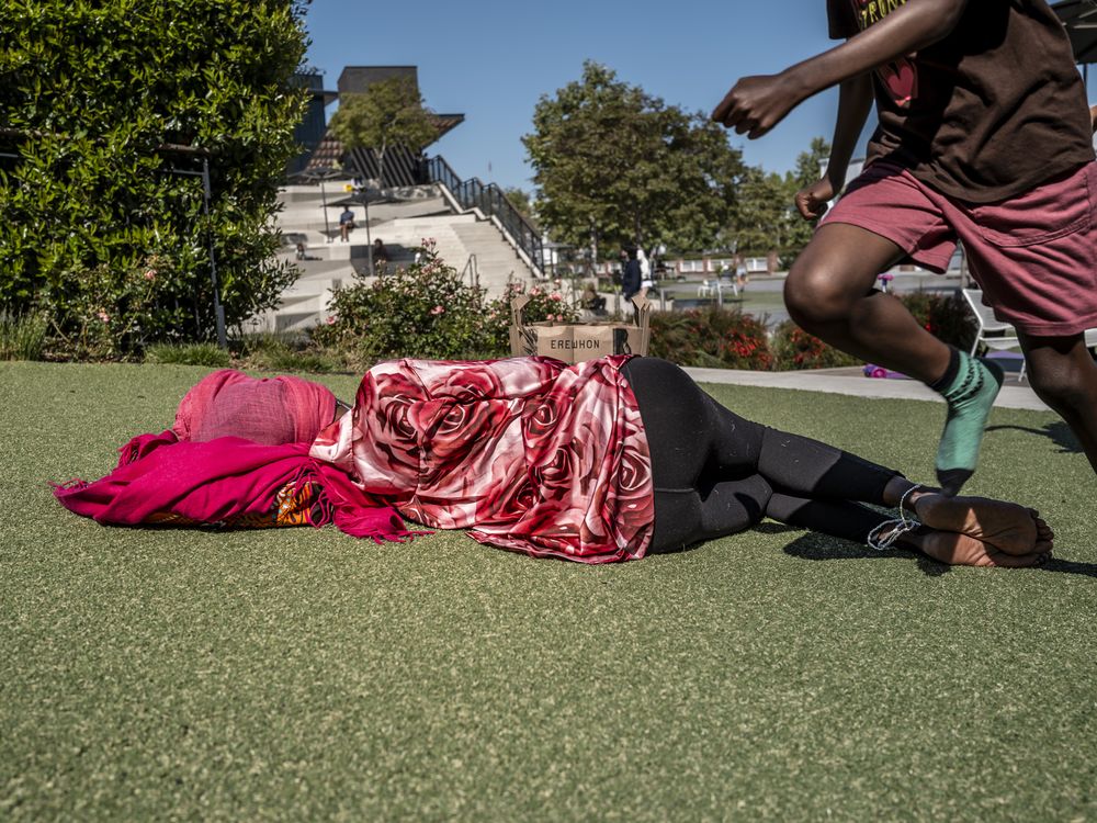 A woman rests in a park and public plaze in Culver City, in contrast to the energy of a young boy running past her.