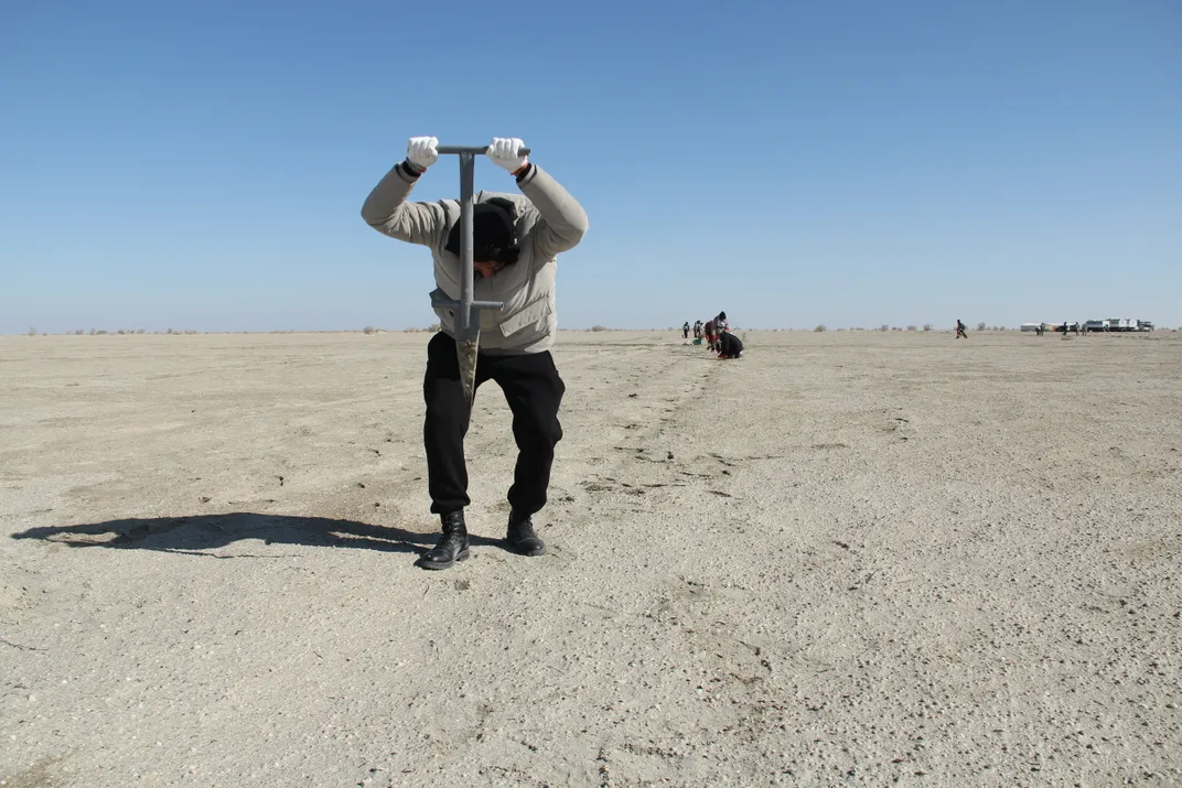 A participant in the campaign to plant saxaul trees on the dry bed of the Aral Sea.