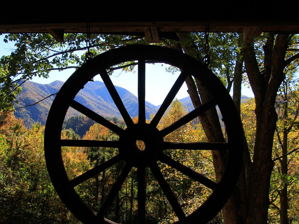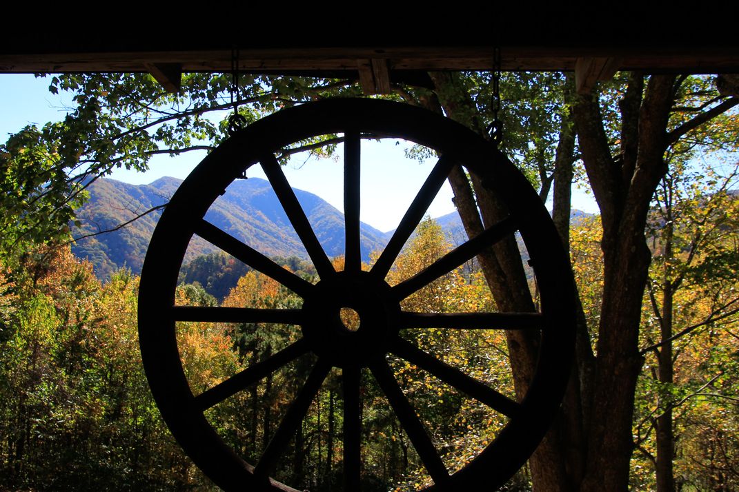 This photo was taken at Smokey Shadows Lodge and Country Gourmet Dining on their back porch which is really the front porch. It's said to be the longest porch in the Smokies and the most magnificent view in Maggie Valley, NC. The lodge is a former gristmill moved to this 4500 foot bluff. Well worn rockers with fluffy pillows and a bottle of wine on the table are all anyone needs to soak in the view!