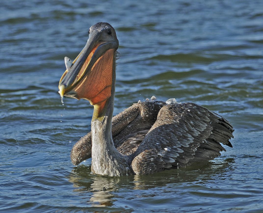 This juvenile Brown Pelican finally caught a little fish after many previous tries. A setting sun provided backlighting for its large pouched bill.