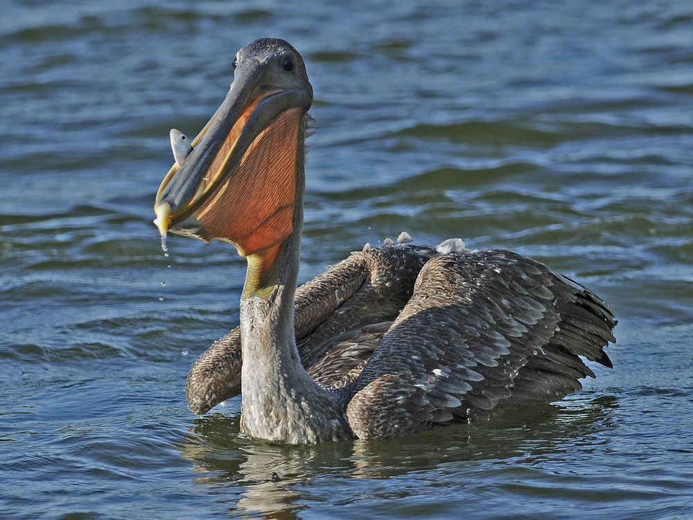 Dinnertime! This juvenile Brown Pelican finally caught a little fish after many previous tries. A setting sun provided backlighting for its large pouched bill.