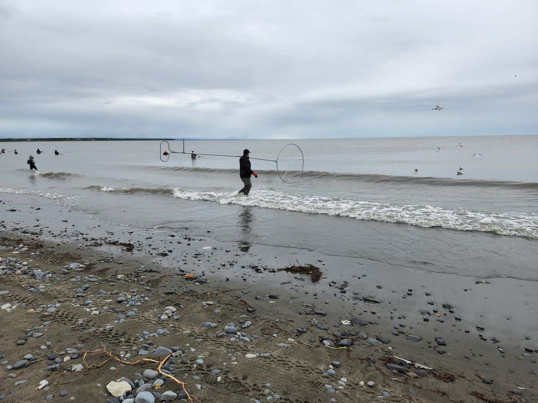 The salmon were running in the Kenai River, Alaska, and the fishermen were out with their enormous nets. The process was fascinating! Locals would line up, waste deep in the surf (background) with these giant nets and pull out 30 lb salmon one after another.