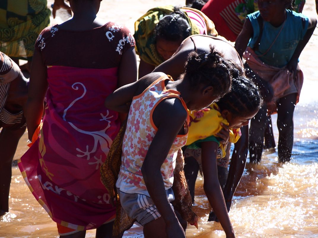 Disembarking from the ferry after crossing the Tsiribihina River. The Malagasy express their thanks for a safe crossing of the river by ritually washing themselves. The river contains Nile crocodile
