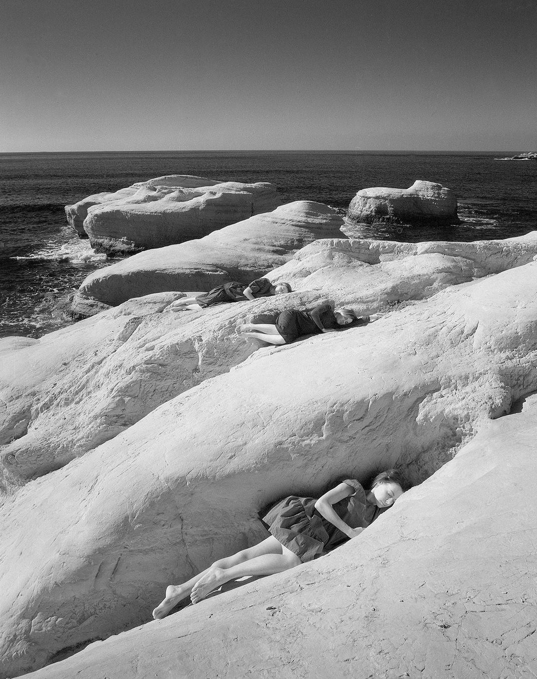 Using film photography with no digital manipulation I pose women in the landscape. By using mirrors, reflections, and forced perspective, I create an illusion in front of the lens. Although they misleadingly appear docile, it is obvious they possess a mysterious power to move the landscape at will. They change shape and scale, picking up parts of the landscape or completely transforming it.