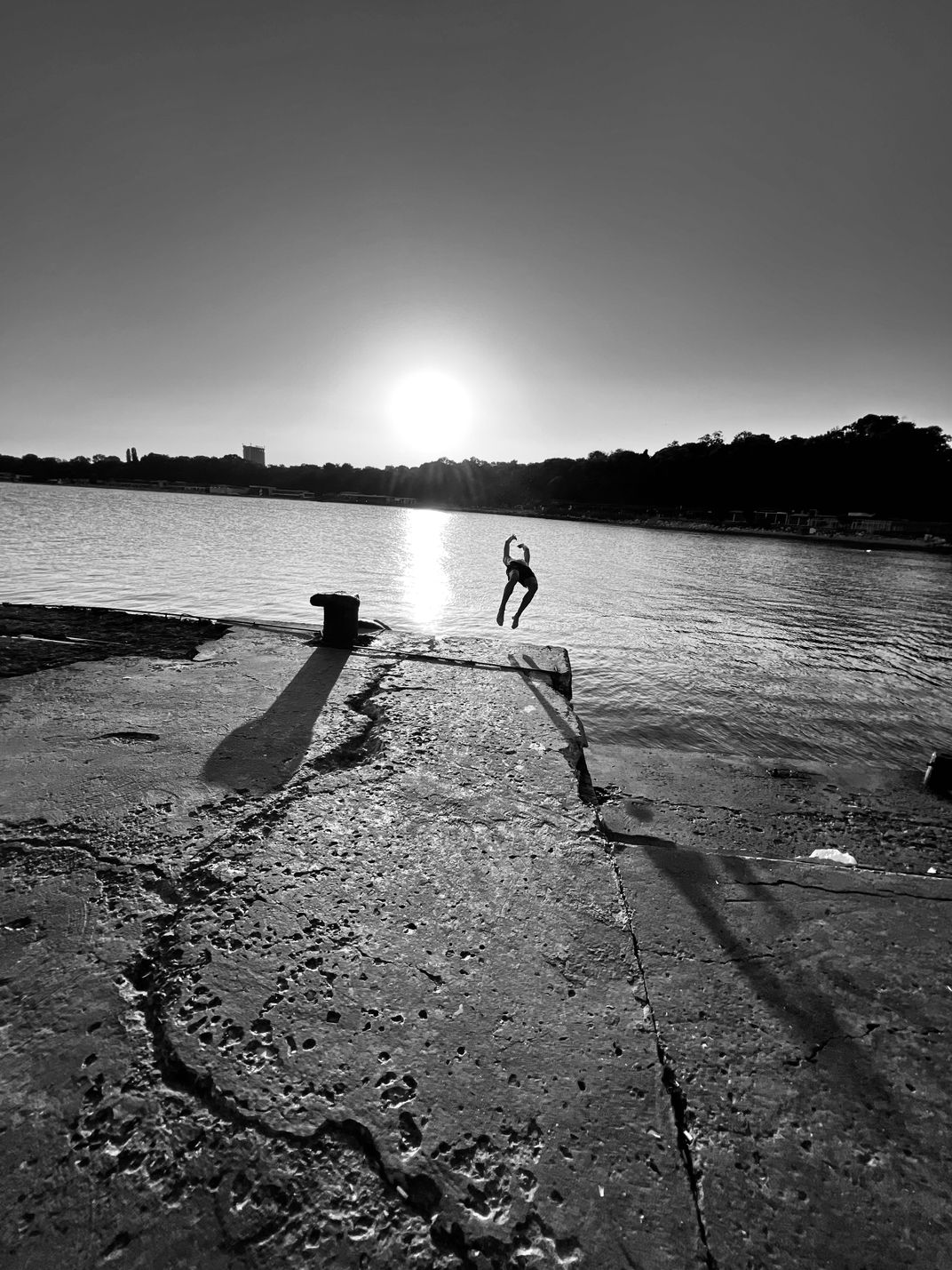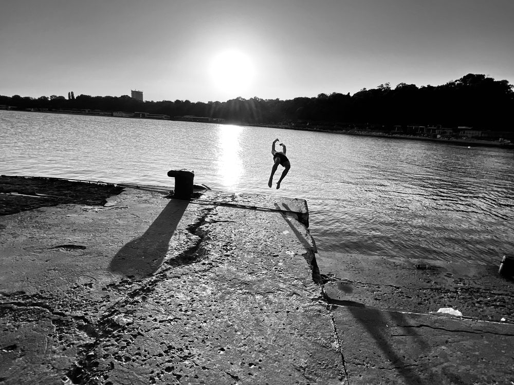 Young swimmer takes a back dive off the jetty in Varna Bulgaria.