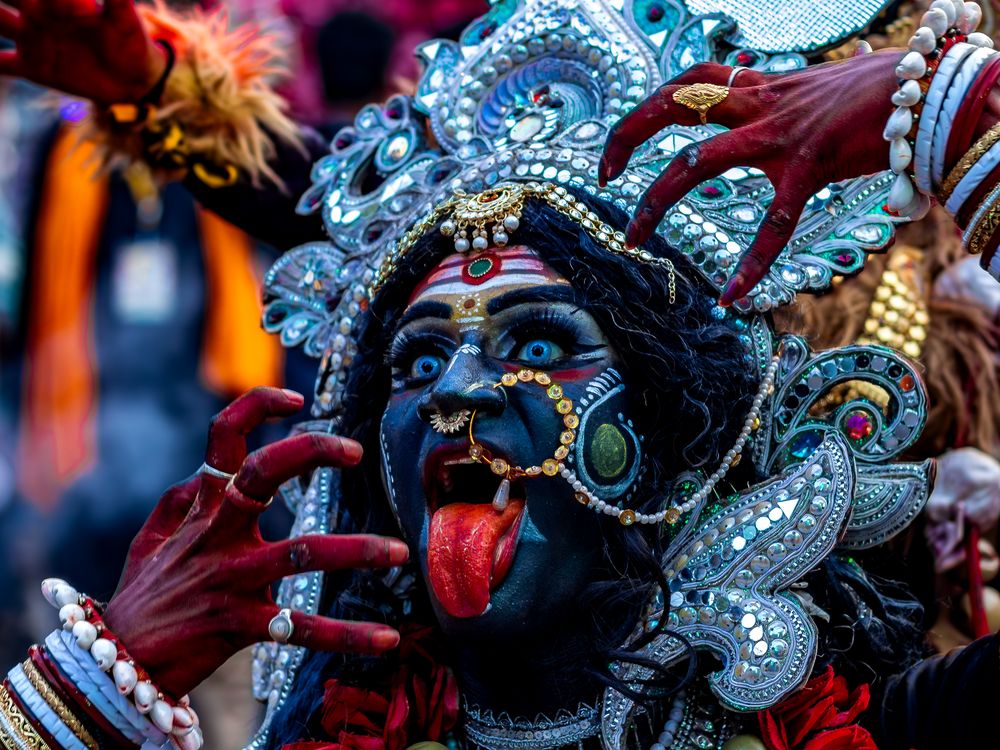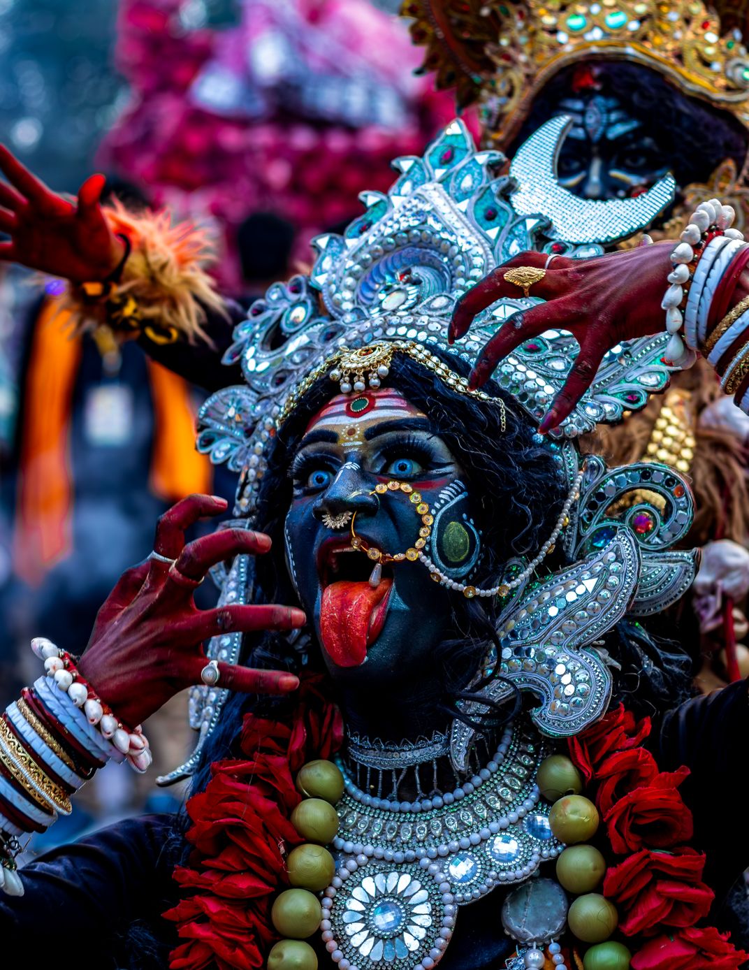 A symphony of divine fury and human expression : This shot captures the raw intensity of a performer embodying Goddess Kali during Dhenkanal's Gajalaxmi Visarjan Yatra. The vibrant blue skin, striking red hands, and lashing tongue freeze a moment of fierce, untamed energy and deep devotion. It’s a powerful snapshot of tradition and raw human emotion colliding in a dazzling display of cultural heritage.