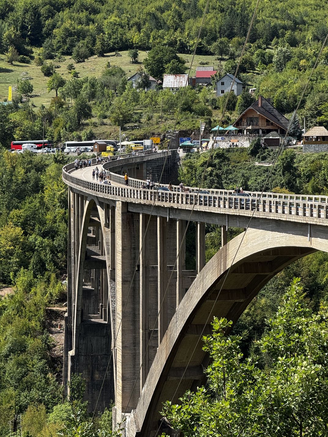 The magnificent Đurđevića Tara Bridge in Montenegro, dramatically spanning the deep Tara River Canyon. This impressive concrete arch bridge is a popular destination for tourists, offering stunning panoramic views and thrilling adventures like zip-lining and white-water rafting in the surrounding lush landscape.