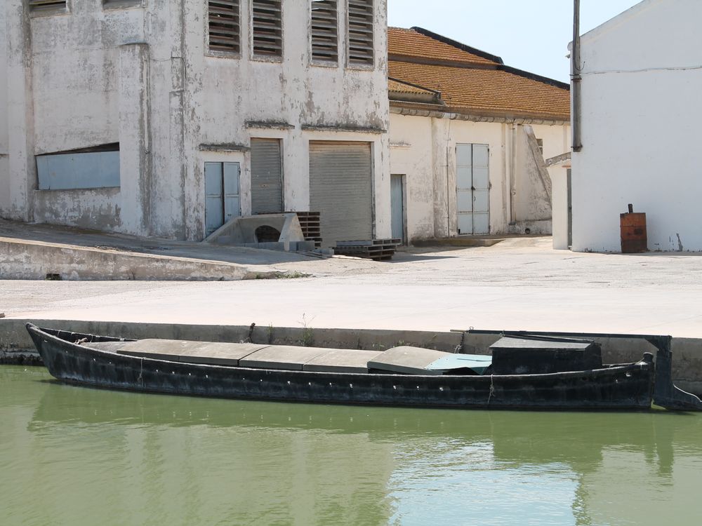 A traditional albuferenc boat rests at La Albufera’s edge, beside old rice‑trade warehouses. The scene reflects quiet continuity, where human livelihood and nature remain respectfully intertwined.