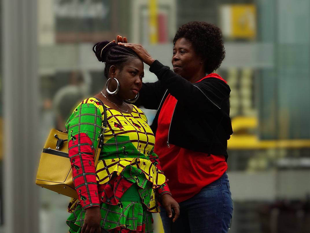 While two ladies wait for the bus, one styles the other's hair