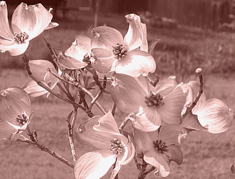 Dogwood blooms in sepia on an old farmstead in Huntington Mills, PA