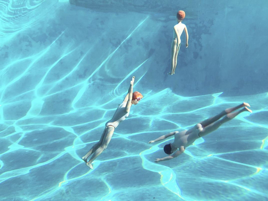 Dolls Posed as Swimmers Gliding Through a Pool’s Blue Depths