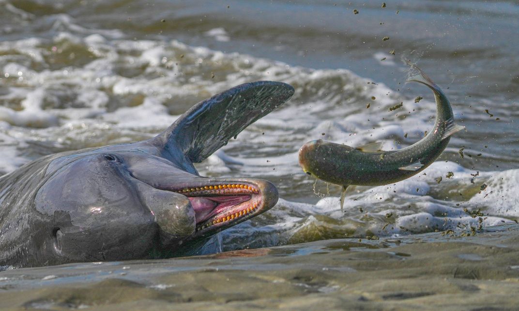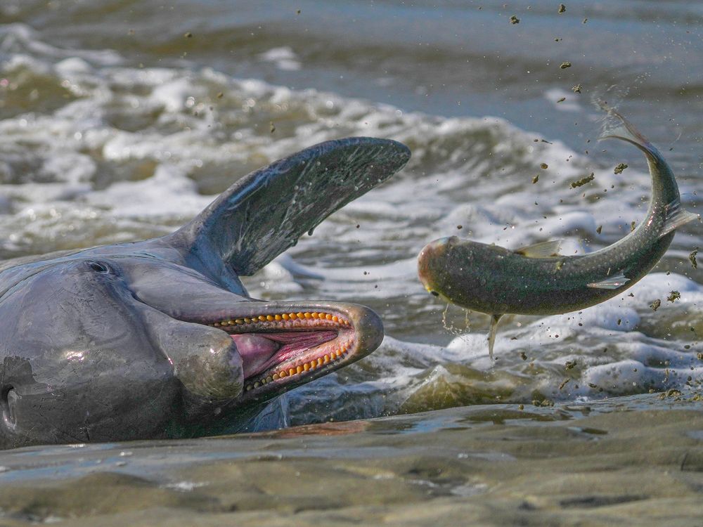 A Bottlenose dolphin strand feeding, catching a mullet for lunch. There are only a few bottlenose dolphins in the world that have learned to strand feed by their parents. These dolphins will herd a school of fish, then propel themselves and the fish up onto the shore and feast on the mullet.