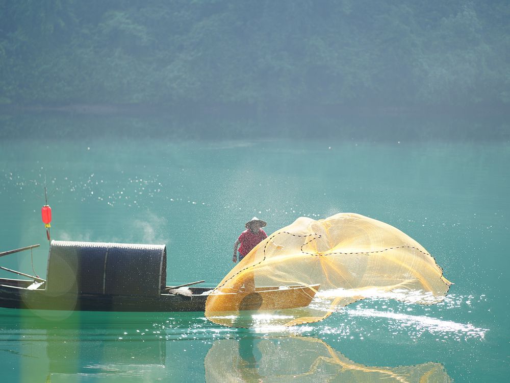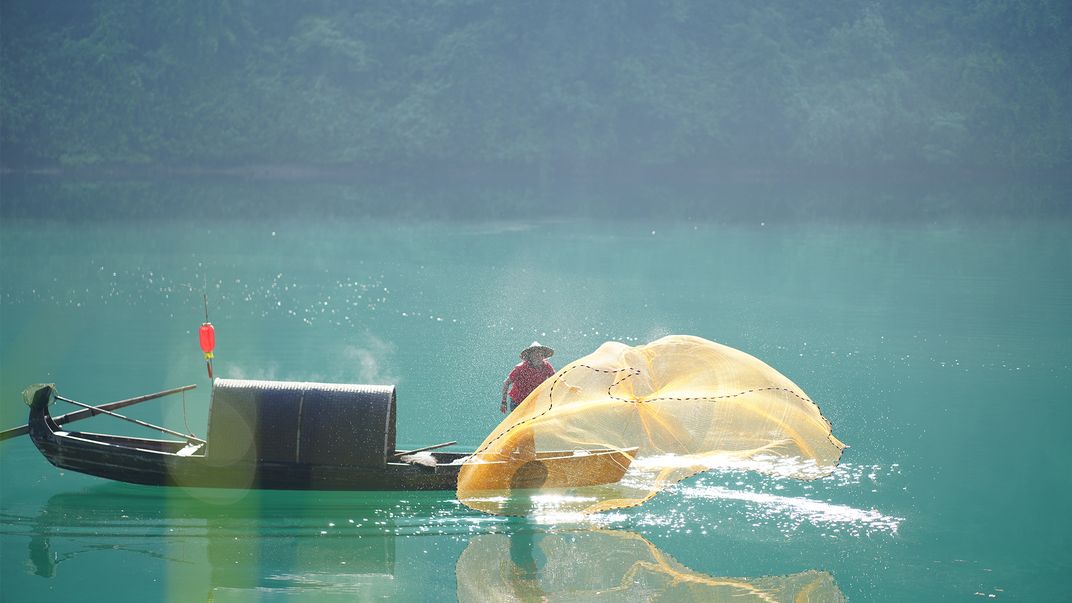 This photo captures the classic moment of the "internet famous fisherman" casting a net in Xiaodongjiang, Chenzhou. The character in the picture is one of the local "models" casting a net, standing on a black roofed fishing boat, vigorously throwing the golden fishing net towards the emerald green water surface. The sunlight penetrates the lake and splashes small spots of light, and the red lantern hanging from the bow of the boat becomes the finishing touch. This photo is a gentle transformation of "fishermen not fishing". In the past, these people casting nets were real fishermen who made a living by fishing and chopping wood in Xiaodongjiang. But with the "Misty Little Dongjiang" becoming a world-class landscape, the scenic area needs a "dynamic finishing touch", and they have become dedicated "net casting models". Every morning around 6 o'clock, they change into eye-catching red clothes, wear bamboo hats, and repeat the net casting action at fixed points, sometimes casting more than 20 nets in an hour, just to cooperate with tourists and photographers to capture the fairyland scene of "fishing boats in the mist". I think what they are fishing for in their net is not fish, but a 'new life of green mountains and clear waters'. The villagers who used to rely on physical strength for survival have now become the "painting immortals" in photography works. They not only earn a more stable income than fishing at their doorstep, but also make their children proud that "parents have become scenery". Every casting of a net in the tourist's camera is a two-way journey between nature and culture. The fishermen used repetitive movements to put the beauty of Xiaodongjiang into the world's photo albums, and the beauty of Xiaodongjiang also transformed their lives from "ordinary guests" to "people in poetry".