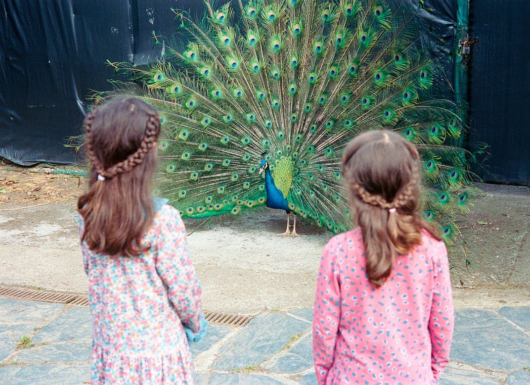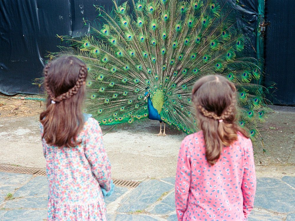A peacock had escaped from its enclosure in a city park and people were approaching it to take pictures. Three sisters were nearby and I was able to take several photos of the moment, although only two are shown here.