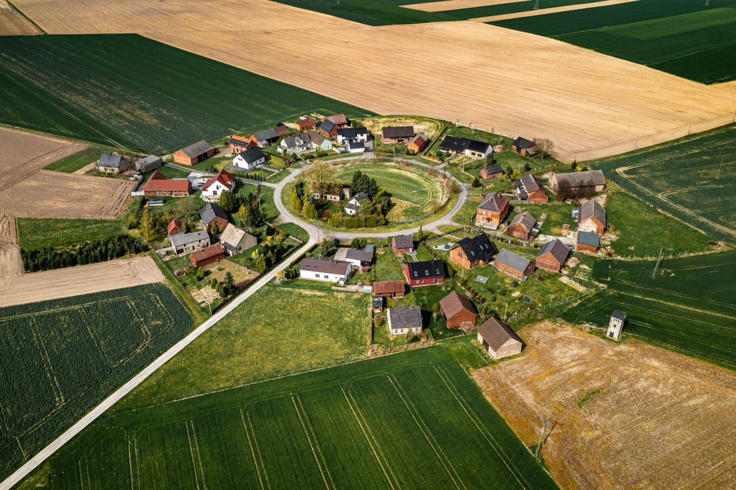 Architecture magic over Lower Silesia reveals a village crafted like a living doughnut: homes and farms form rings around a central hub, accessible by a lone, straight path. Encased in a sea of fields, this rare circular layout embodies rural harmony and agricultural circulation.
