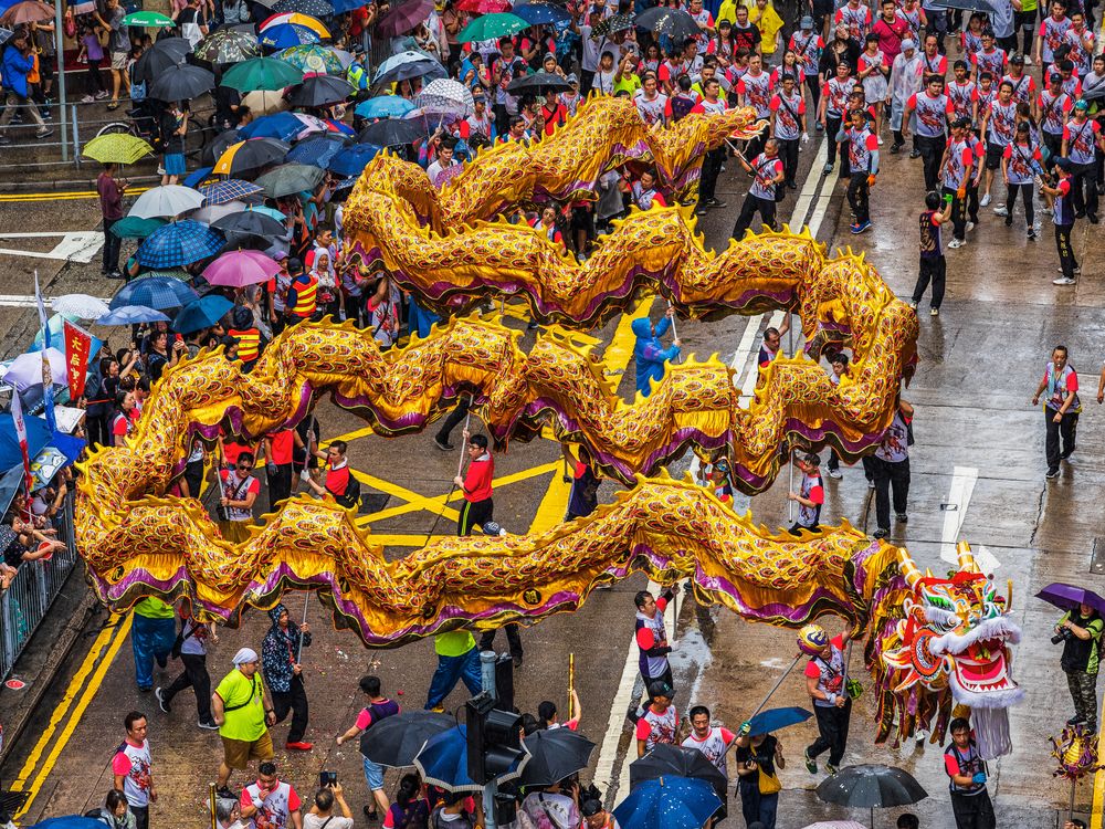 People perform dragon dances in the rain during a festival in Hong Kong.