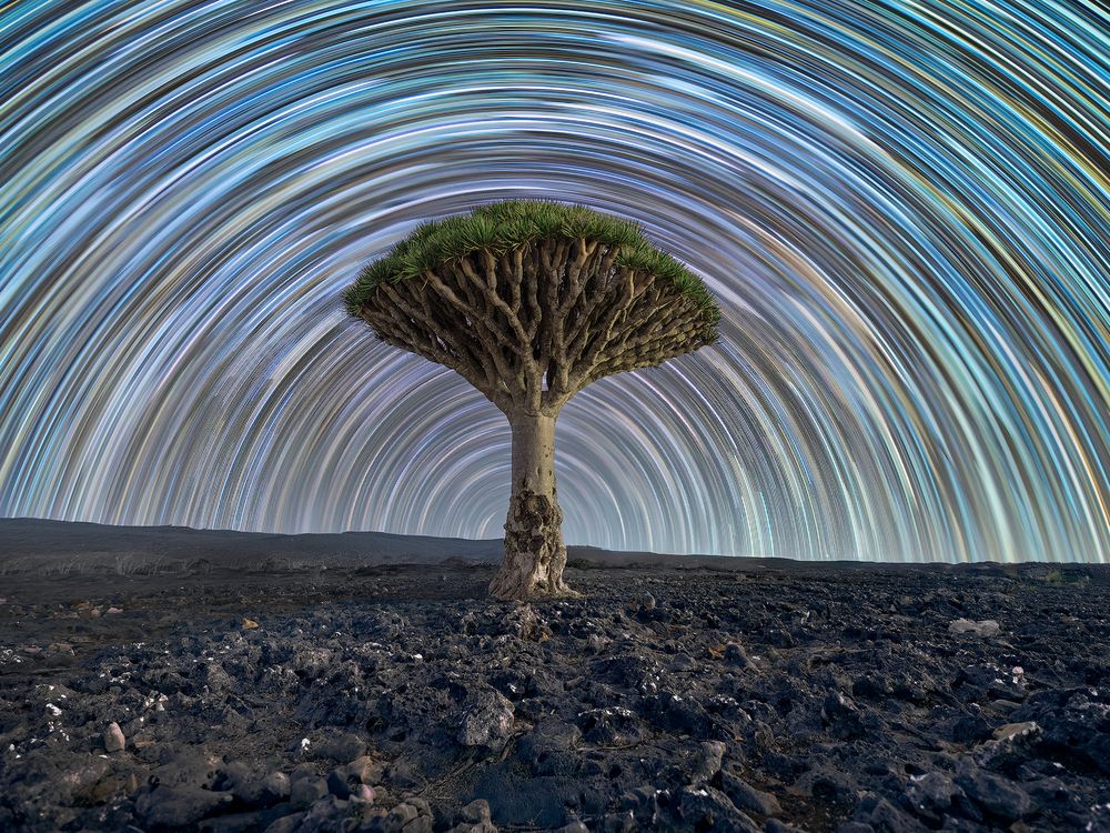 A lone Dragon Tree on the Diksam Plateau in Socotra, Yemen, under an evening of star trails. The Dragon Tree can only be found on the island of Socotra and is called such because of the thick red resin the Socotra locals call 'dragon's blood'.