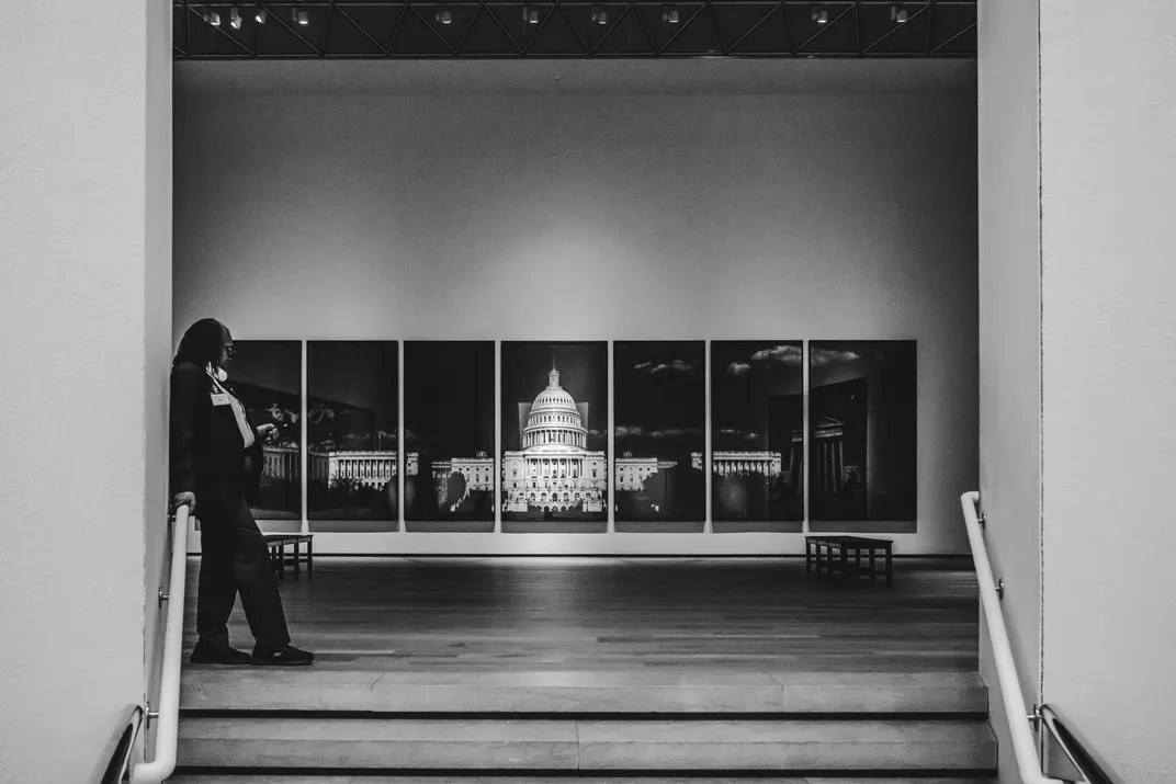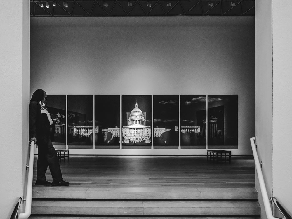 The Gallery of Art in Washington, D.C., has various exhibitions. One of them shows the black and white drawings of Robert Longo, the Whale (The United States Capitol). In total, there were three drawings in the room. They are made with charcoal on seven sheets of paper mounted to aluminum. At first, I was sure it was a photo, but after reading the description, I discovered it was painted.
