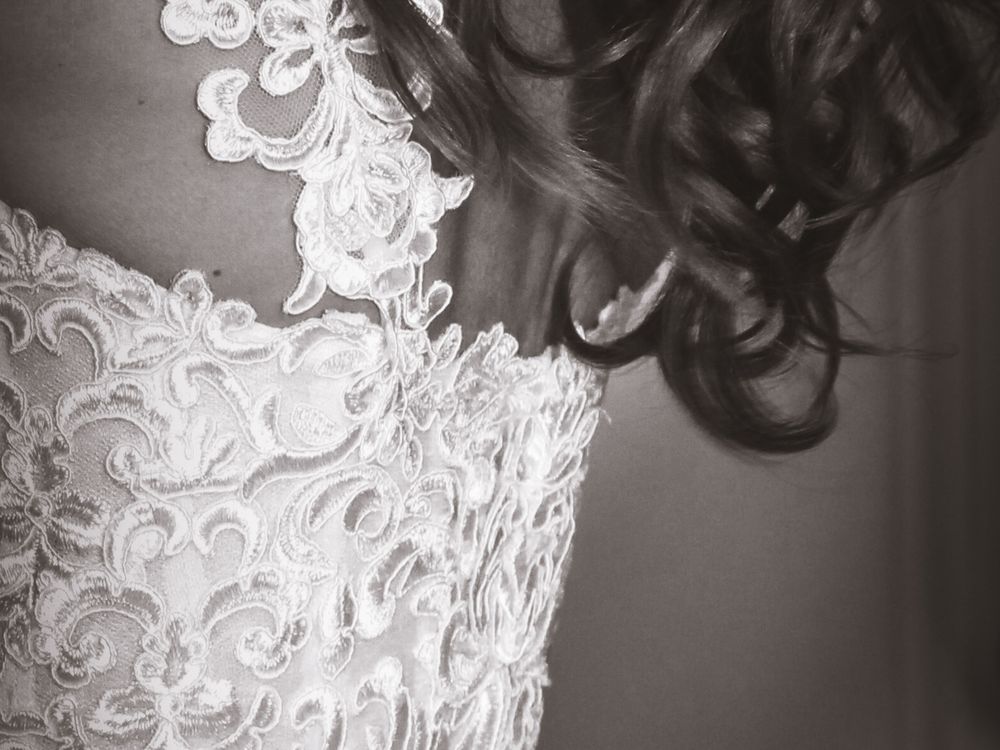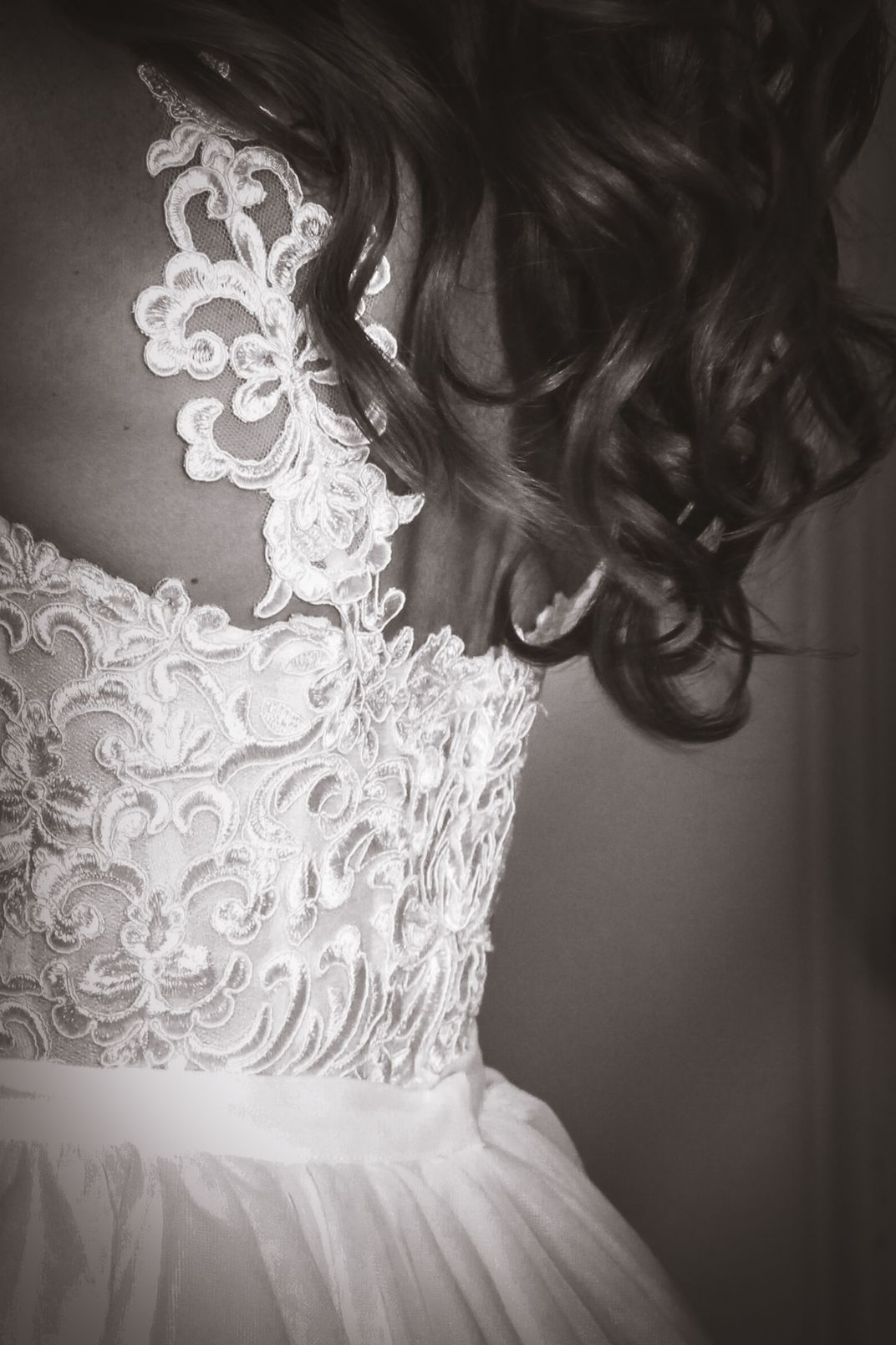 Dress detail with beautiful hair adjacent on her wedding day.