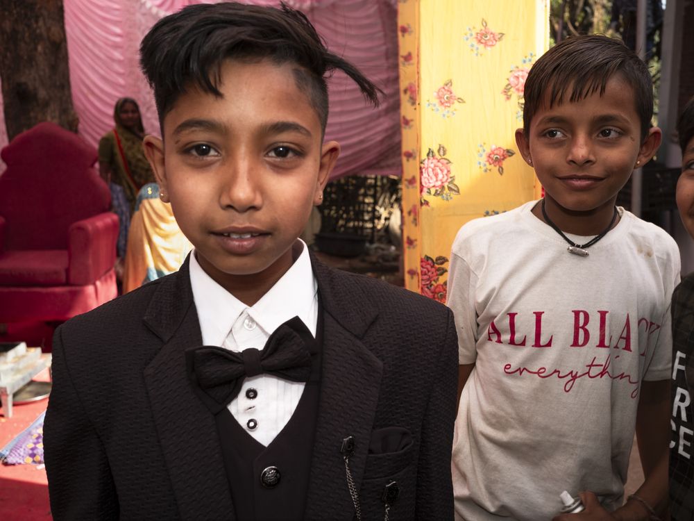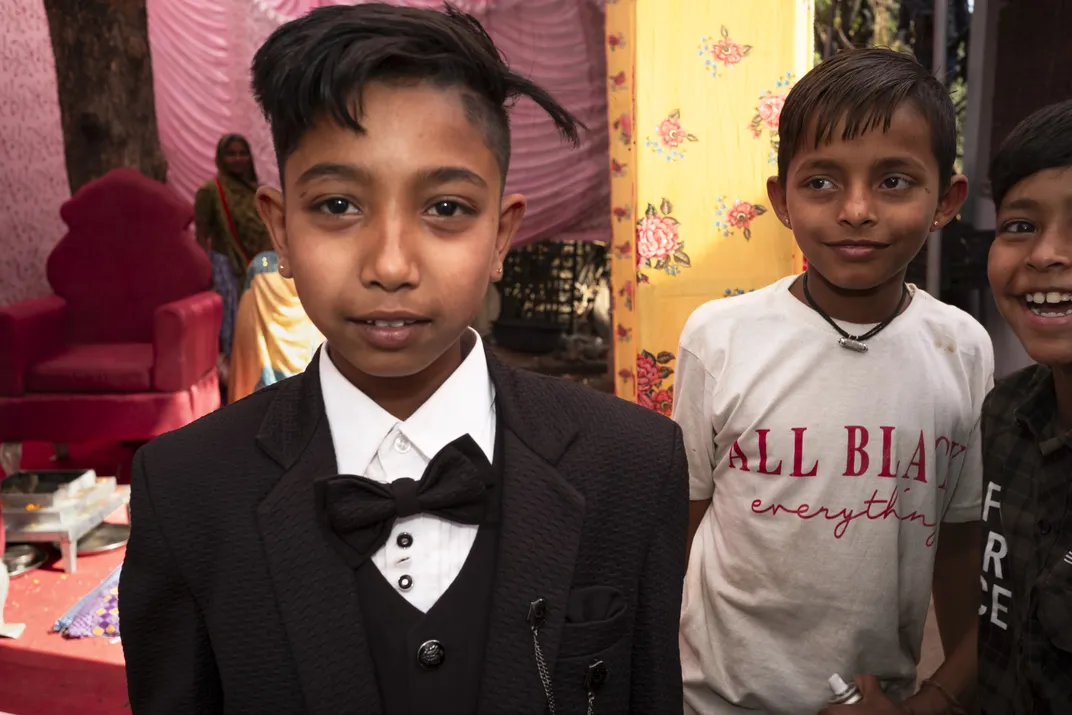 These boys were guests at a family wedding in a rural village in Gujarat, with the bride's brother wearing a suit for the occasion.