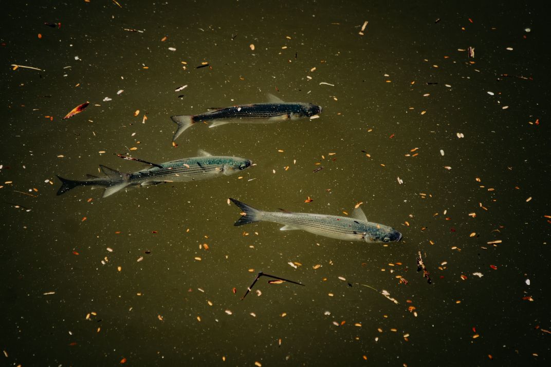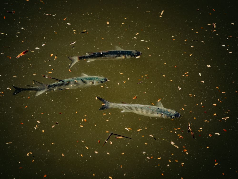 This photograph captures three mullets swimming in the brackish waters of the Ciane River in Sicily. Their silvery bodies move in quiet synchrony, cutting through a surface scattered with dry leaves and pale organic fragments. The stagnant water, textured with subtle debris, creates a visual contrast that feels both natural and composed. The image reveals a moment of calm within a dynamic ecosystem, where movement, decay, and light converge to form an unexpectedly balanced scene.
