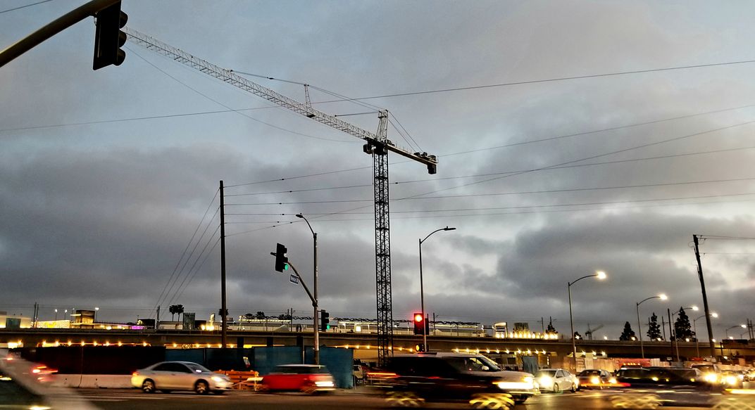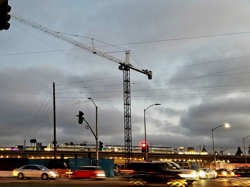 Venice Blvd in Los Angeles. Going home after work , because I loved the colors, the wires, the work equipment. Los Angeles, is always demolishing , building, gentrifying which is wonderful and tragic at the same time.