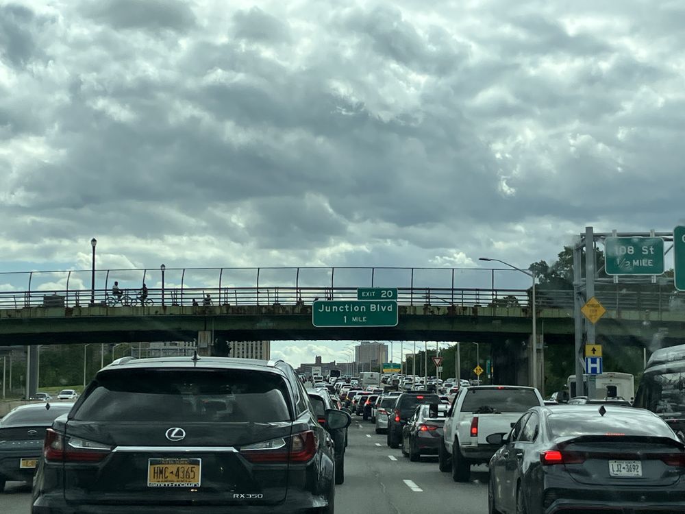 On a highway in Queens, NY, traffic is inching slowly along. It looks like Junction Blvd. is where vehicles meet the beckoning clouds.
