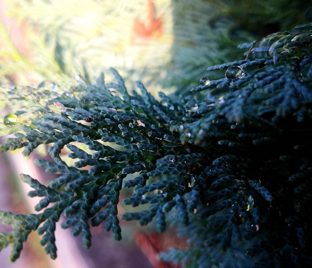 Tiny drops of water resting on evergreen leaves, reflecting the soft morning light. A simple yet mesmerizing reminder of nature’s quiet beauty.