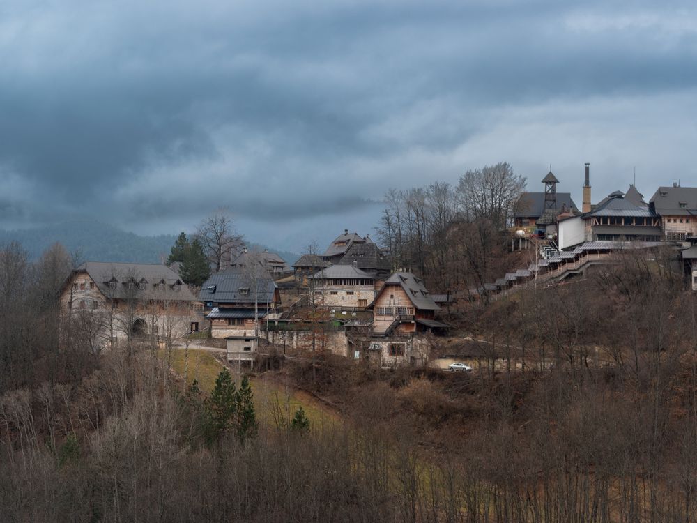 The photo shows the panoramic view of the etno village 'Drvengrad' ('Mećavnik') on Mokra Gora in Western Serbia. Mokra Gora, nestled between the Tara and Zlatibor mountains, was selected as the best tourist village in the world by United Nations World Tourist Organisation (UNWTO) in Madrid in 2021 due to its unique natural beauty, ritch cultural heritage, sustainable tourism and biodiversity. Main attractions of Mokra Gora are Šargan Eight Railway, Drvengrad (Mećavnik) and healing waters.