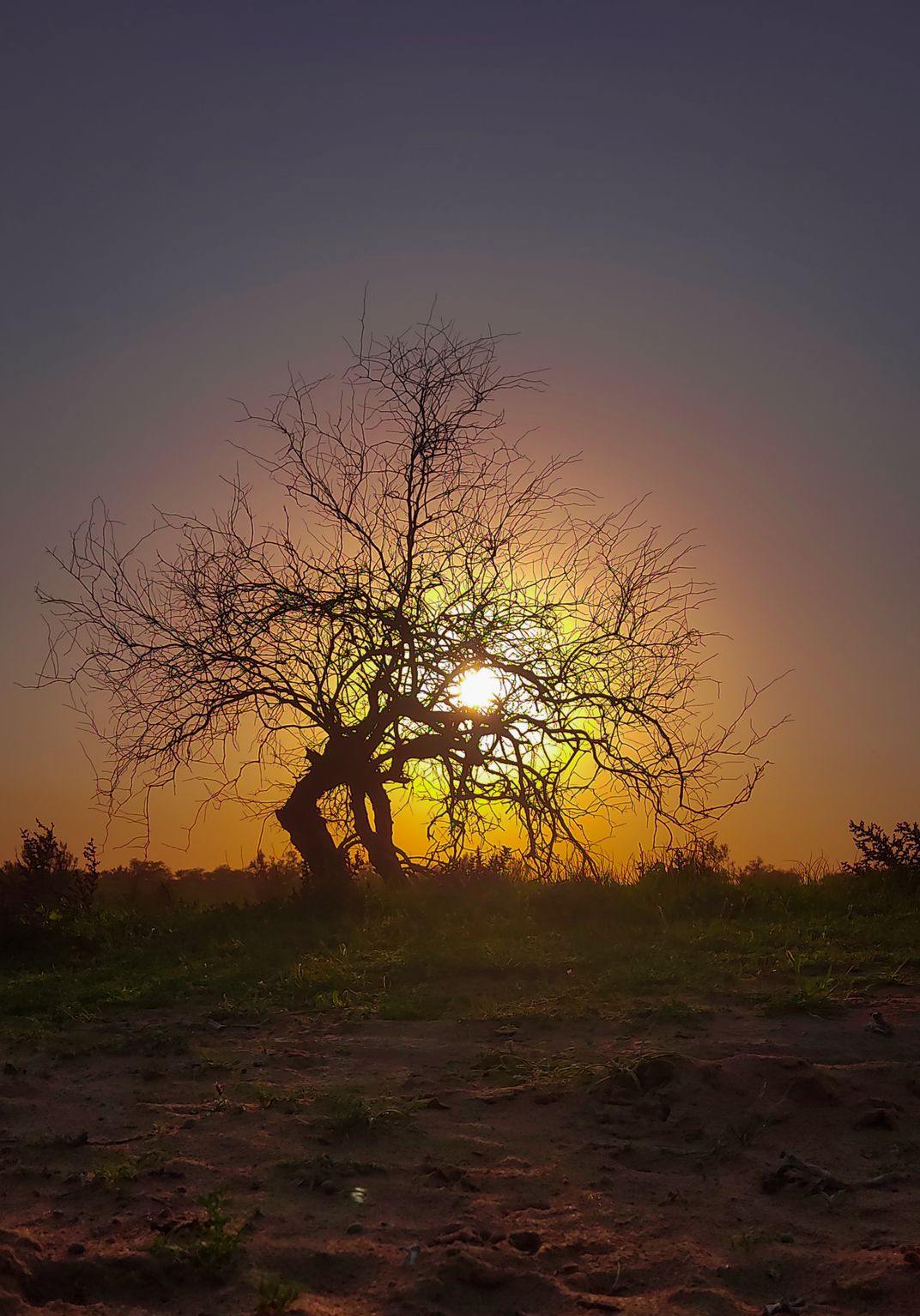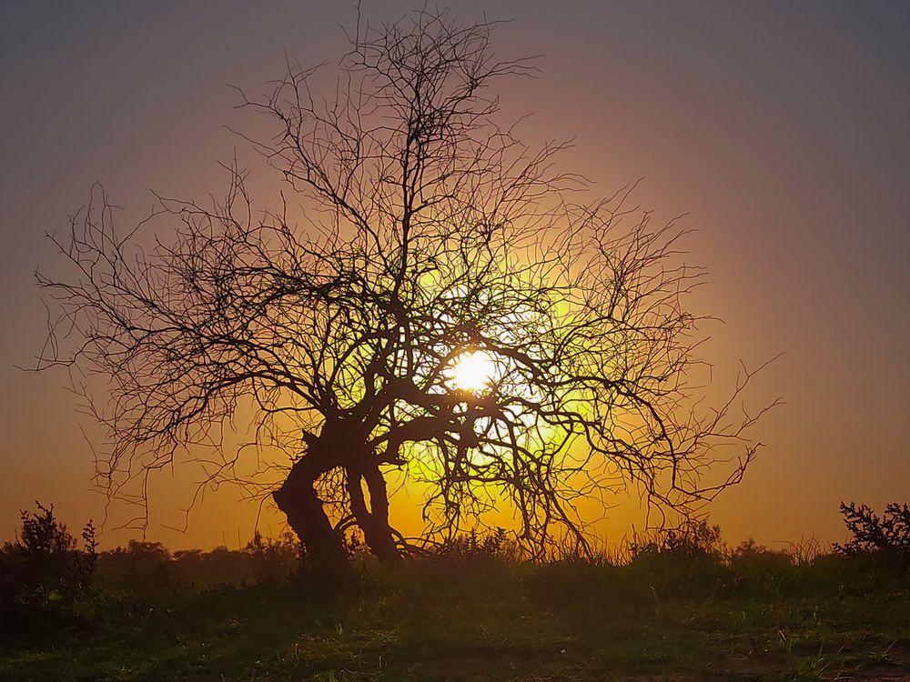 At sunset, I saw a beautiful shrub, although it did not have a leaf, it depicted the beauty in the brown soil.