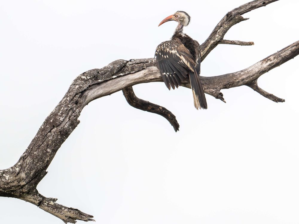 A yellow billed hornbill is drying his feathers in a dead tree.