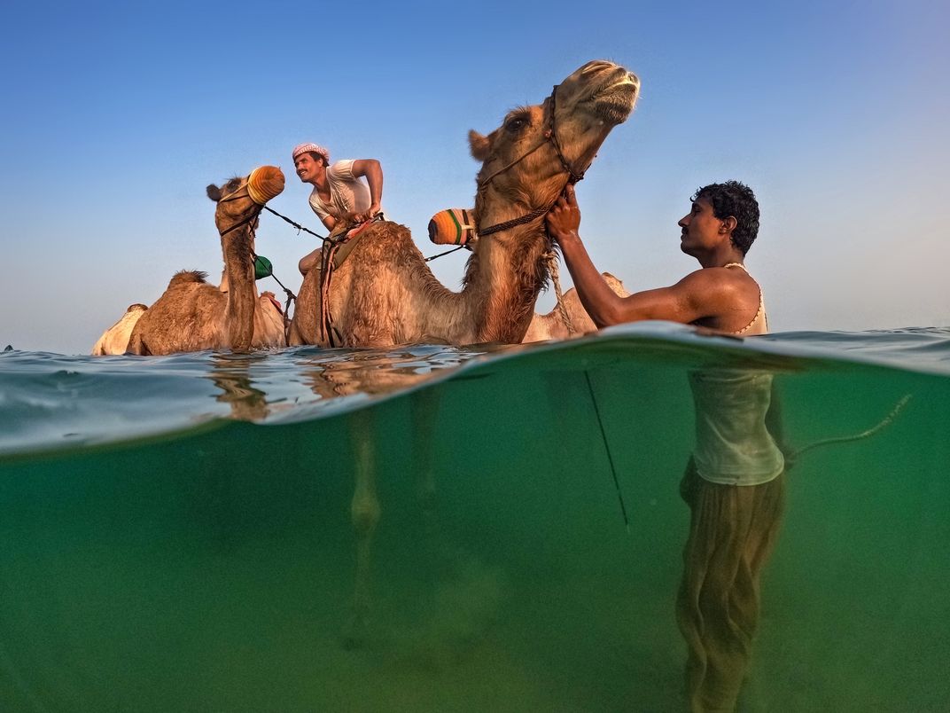 This breathtaking photograph seizes a spellbinding moment in Umm Al Quwain, presenting an extraordinary half-water, half-air perspective of a camel bath. Above the shimmering surface, camel owners can be seen guiding their majestic camels into the sea, an age-old ritual performed to mend the animals' wounds and scratches. The scene is a living testament to the blend of tradition and natural beauty, as the sun casts a golden hue over the water, illuminating the time-honored practice with a celestial glow.