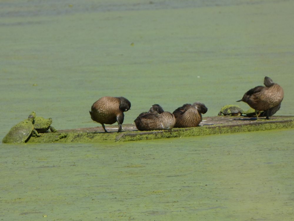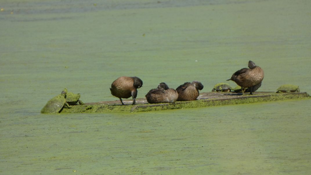 Mallard ducks and painted turtles enjoying the sunshine on a log in a pond in the wetlands of a preserve.