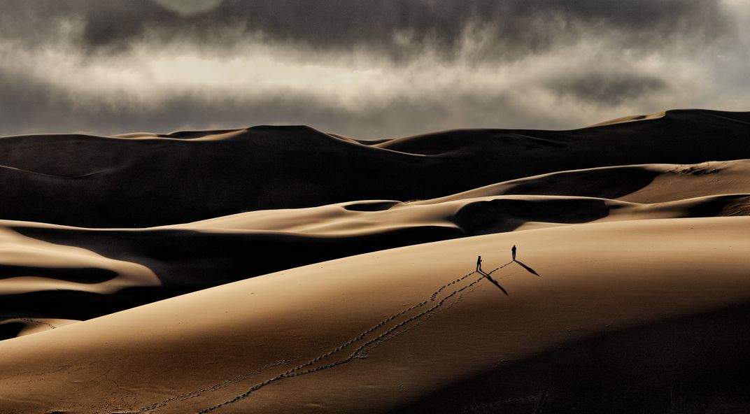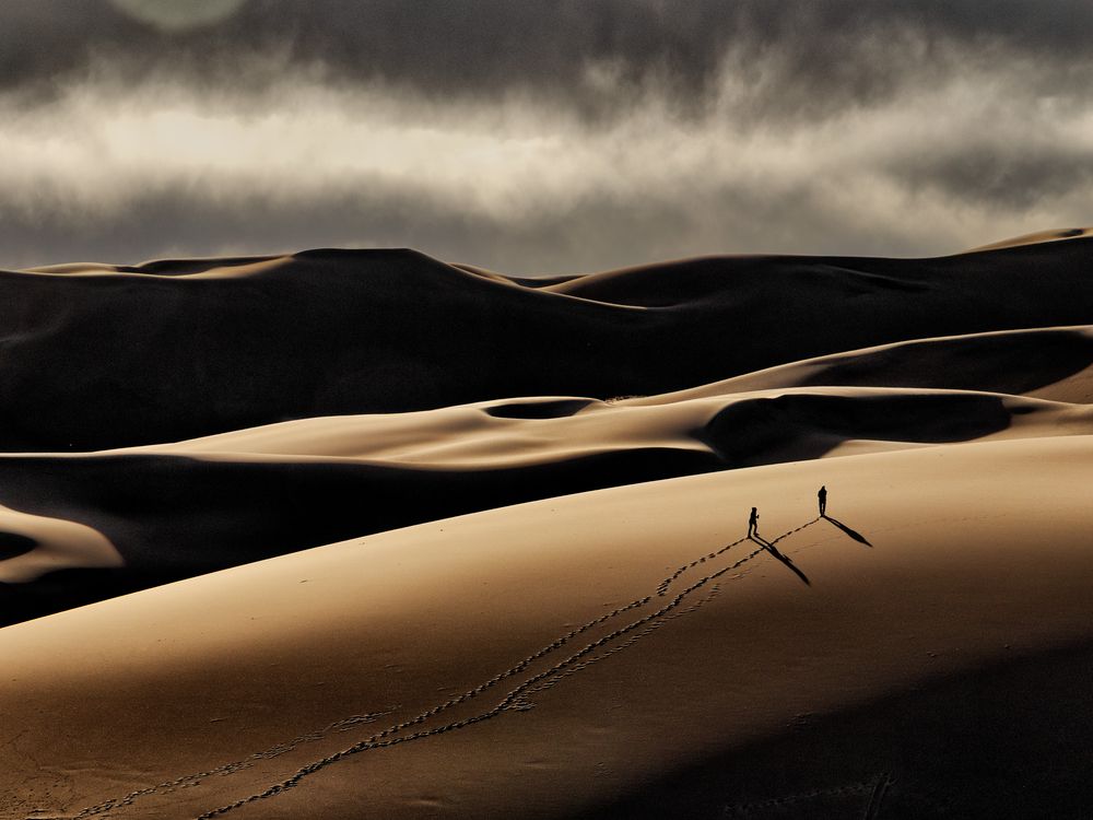 Two figures climb a dune within Great Sand Dunes National Park, CO, miniscule in comparison to the 30 square miles of sand that stretch before them. The dunes can be a lonely place, even if you have someone walking beside you.