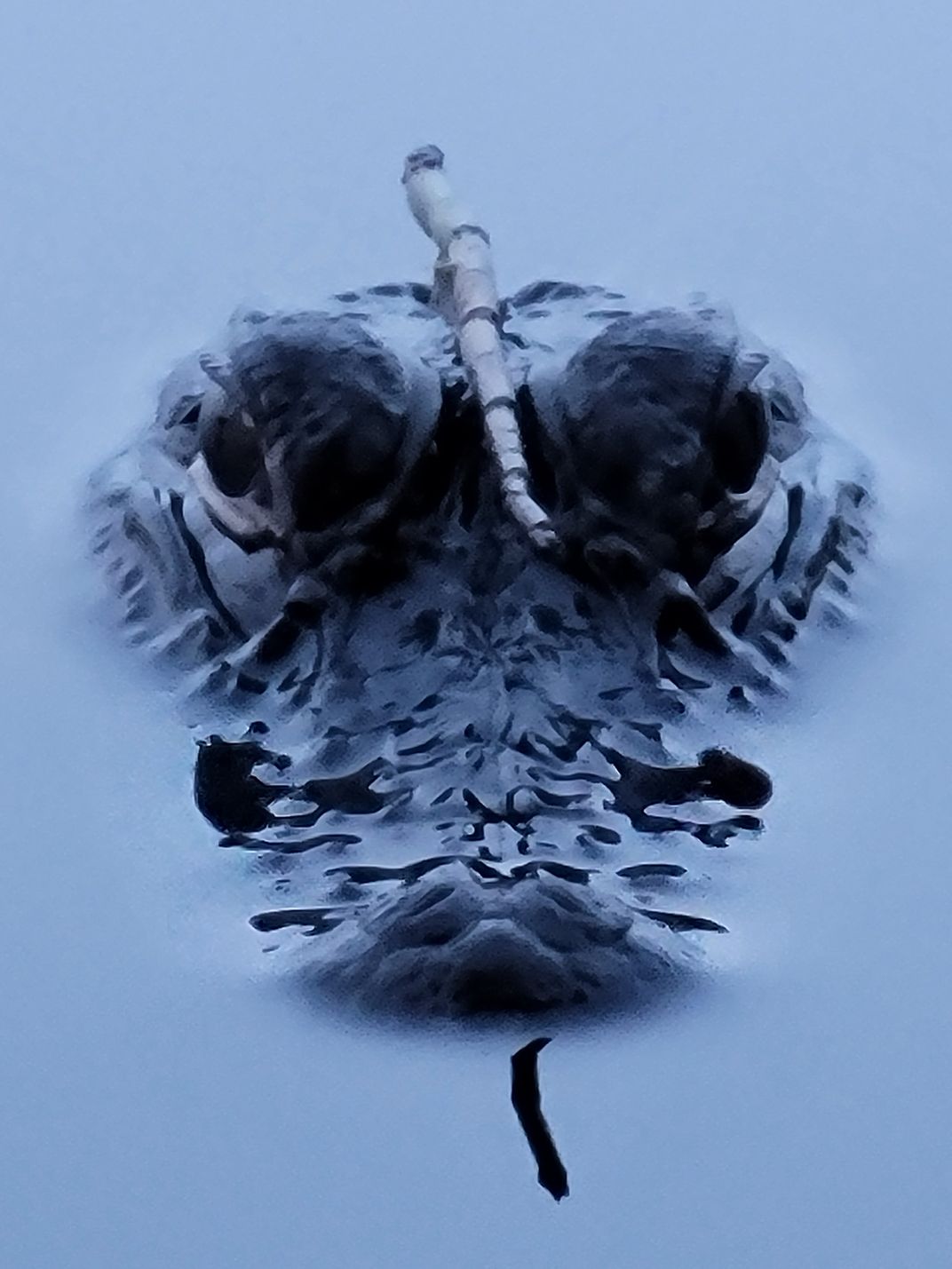 A Florida Alligator at dusk with a stick on his head.