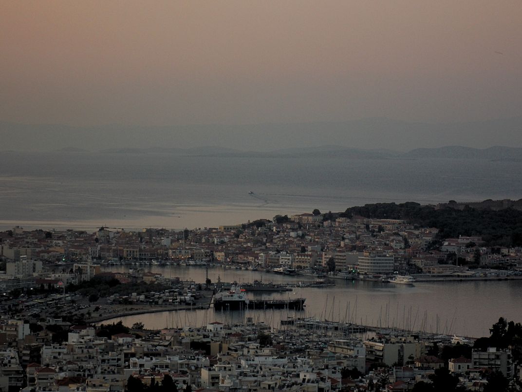 Soft dusk light settles over the harbor as the sea fades into muted pastels. The town glows gently below, framed by calm waters and distant islands disappearing into the haze.