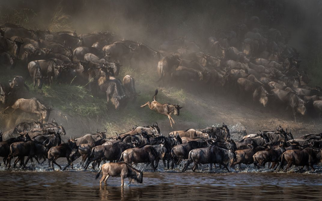 Wildebeest crossing the Mara River in the northern Serengeti. Patient waiting paid off with one of the most memorable crossings last August. Somewhat diffused sun that morning and clouds of dust. A dramatic young gnu jump provided an atmosphere almost as if from a Dutch Golden Age painting.