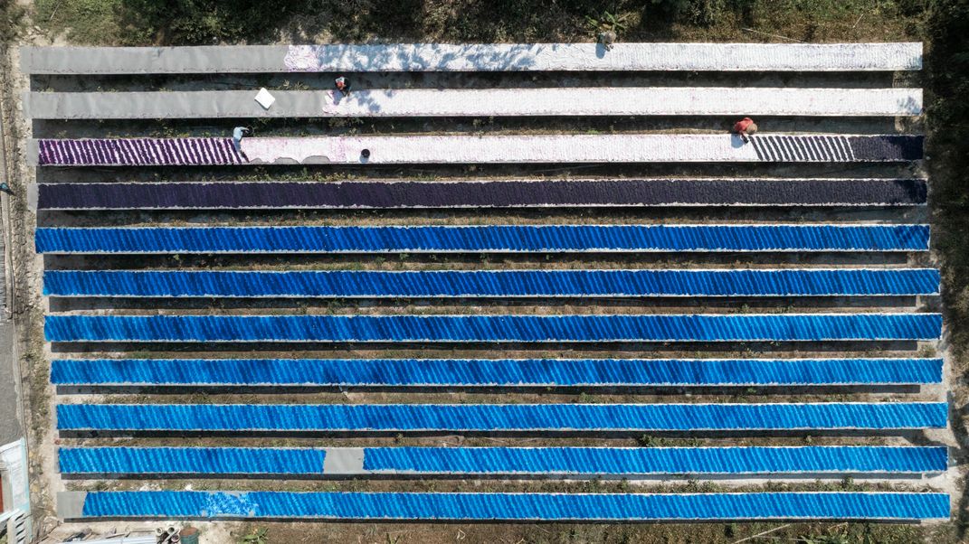 Locals dyeing cloths in java. The men all have a certain task one cleans, one lays out one colour the other a different shade to create an intricate pattern from above.