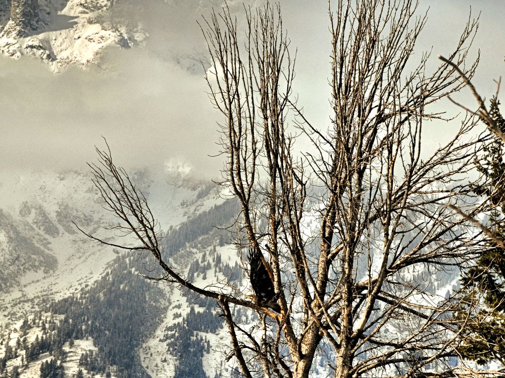 Eagle departing a tree on a frosty morning in front of the Grand Teton mountain range.