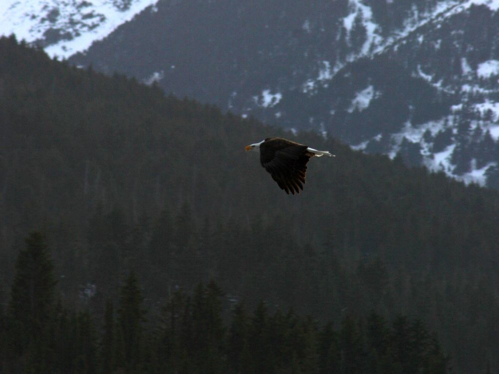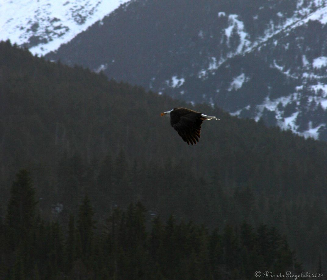 Eagle in Flight over the Kenai River against the trees and mountains of Cooper Landing Alaska