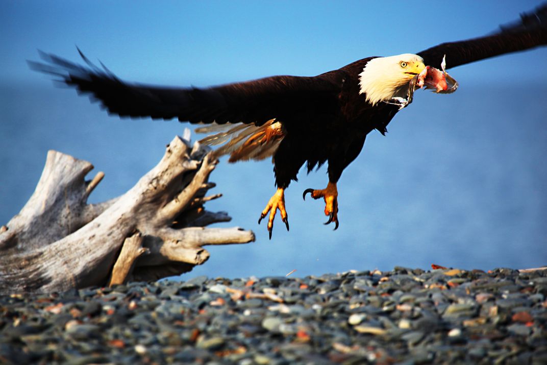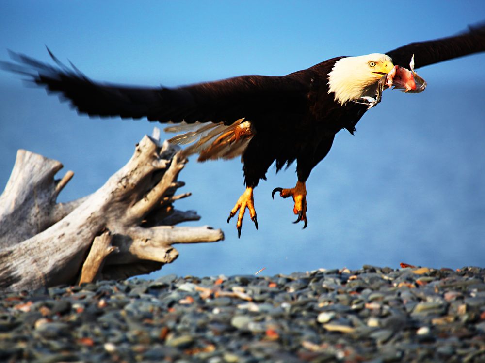 Eagle taking off with food in beak