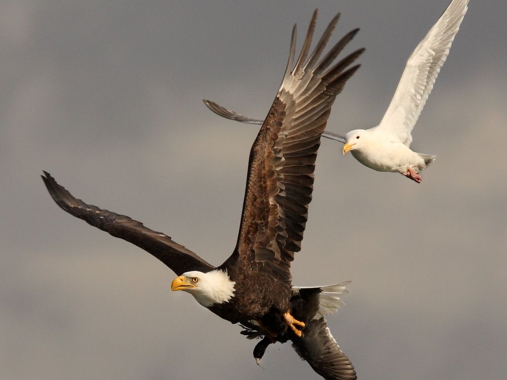 Eagle with coot kill is chased by a gull