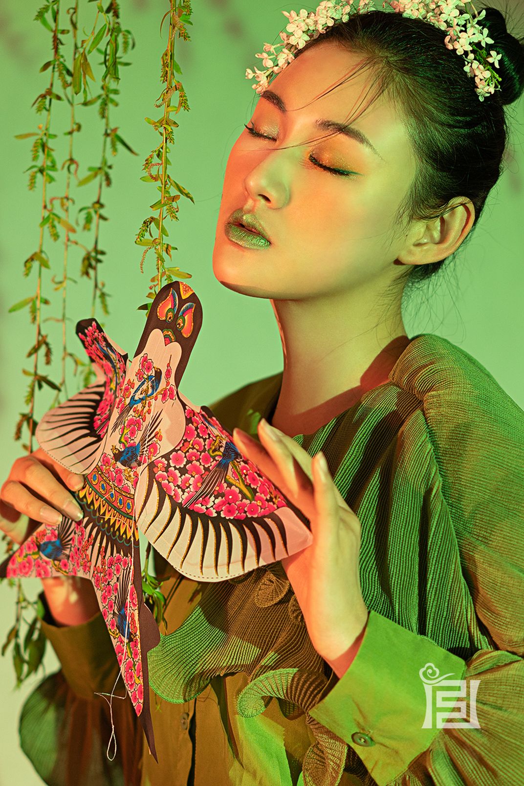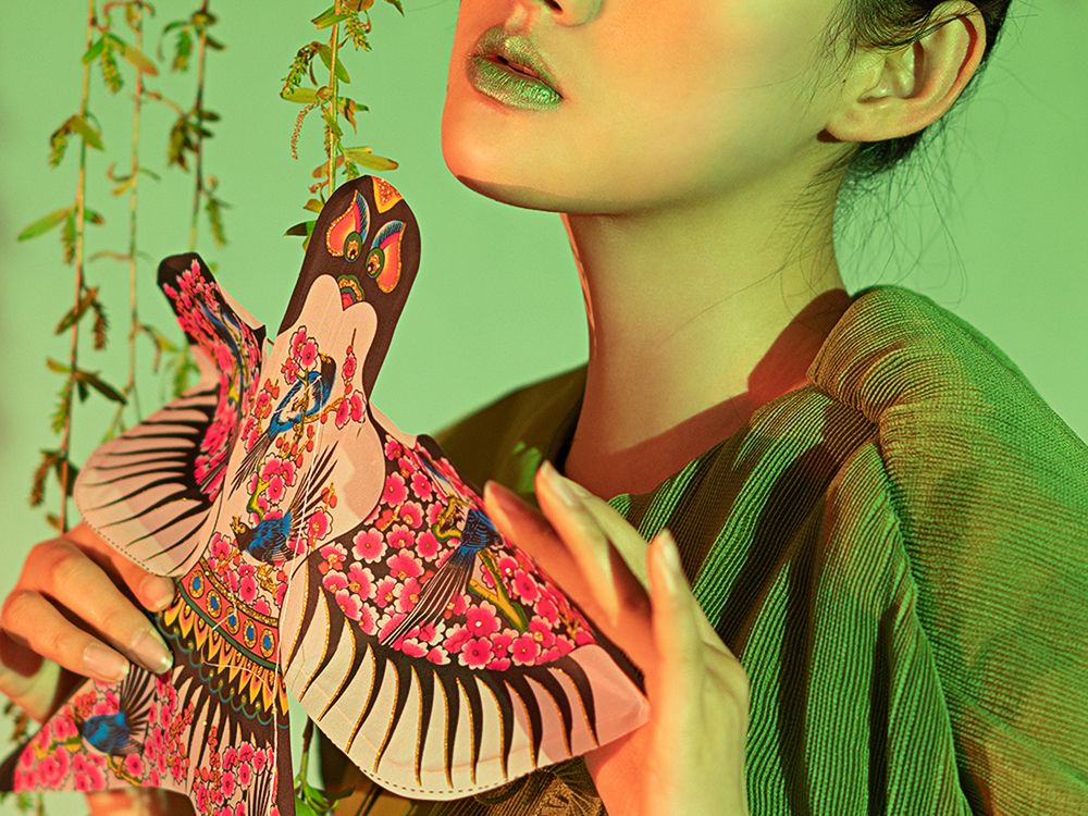 The grass is green and the willows are yellow , and the paper kites are flying in the breeze.