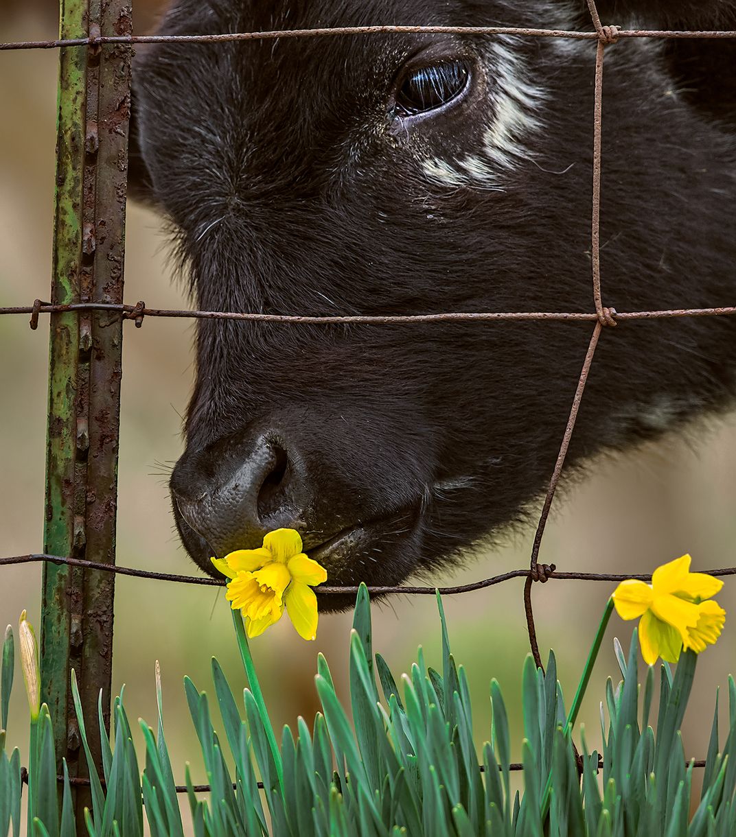 This photo was taken where thousands of buttercups lined a half-mile stretch of a country road outside city limits. The photo shows a cow sniffing a buttercup through a wire fence on the roadside.